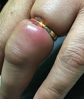 I got a bit overwhelmed with so much liveliness in the reserved pizza room and began biting on my ring to feel better. Except this time, I bit too hard. Instead of my usual biting on the top or bottom, I bit from the side. And instead of readjusting to a normal size, the ring dug right into the fatty part of my finger and stayed. *Disclaimer: this is not my finger, but definelty resembles what it looked like!* No amount of teeth manipulation could get it unstuck, and the harder I tried, the tighter it got, to the point it started to swell and turn purple. Soon enough, you could barely see the ring through the flesh that continued to puff and swell. And this was all while my family was celebrating my brother and I didn’t want to make noise.